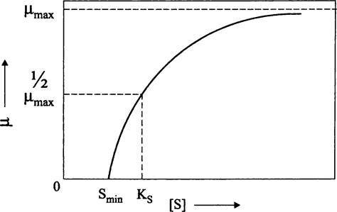 Рис. 284. Зависимость между удельной скоростью роста бактерий и концентрацией лимитирующего субстрата. μ — удельная скорость роста; S — концентрация лимитирующего субстрата; Smin — минимальная концентрация лимитирующего субстрата; КS — константа Моно.