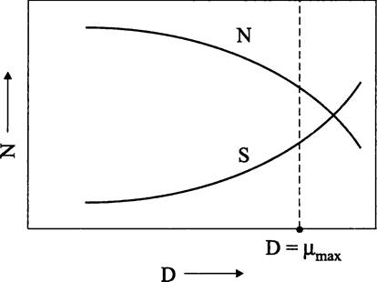 Напомним, что удельная скорость роста μ = dN/dt • 1/N, т. е. dN/dt = Nμi. В свою очередь, скорость разбавления D = -dN/dt • 1/N, т. е. -dN/dt = ND.