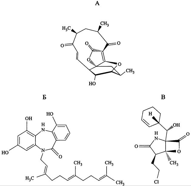Рис. 286. Примеры новых антибиотиков, образуемых морскими актинобактериями. А — абиссомицин С (Verrucosispora sp.); Б — диазепиномицин (Micromonospora sp.); В — салиноспорамид А (Salinispora tropica).