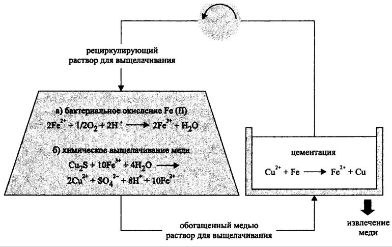 Для выщелачивания меди, как правило, используются не чистые культуры бактерий, а смешанные природные популяции. Чаще всего из промышленных установок можно выделить железоокисляющих бактерий At. ferrooxidans и L. ferrooxidans. При разрушении медно-серных минералов в качестве промежуточного продукта образуется элементная сера, обволакивающая частицы руды и затрудняющая доступ к ним; поэтому при выщелачивании меди большое значение имеют бактерии, окисляющие элементную серу, в частности At. thiooxidans.