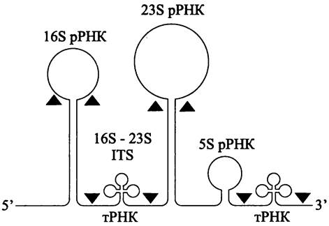 Путем анализа вторичной структуры пре-рРНК было установлено, что в первичном транскрипте комплементарные сайты спариваются друг с другом, образуя два двухцепочечных стебля, которые несут на концах непроцессируемые 16S рРНК и 23S рРНК (рис. 174).