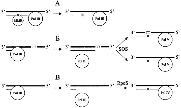 Рис. 198. Причины повышения частоты точечных мутаций на примере Е. coli. А — дефект системы репарации ошибок спаривания; Б — репликация «поверх повреждения» с помощью, SOS-индуцированной ДНК-полимеразы Pol V (сверху — мутация в поврежденном локусе, снизу—«неадресная» мутация из-за ошибки Pol V); В — индукция RpoS- регулона при голодании, вызывающая адаптивную экспрессию «склонной к ошибкам» ДНК- полимеразы Pol IV. Pol III — репликативная ДНК-полимераза; MMR — система репарации ошибок спаривания; ТТ — тиминовый димер; SOS — индукция SOS-регулона в ответ на фотоповреждение ДНК; Pol IV и Pol V — SOS-полимеразы. х — точечная мутация.