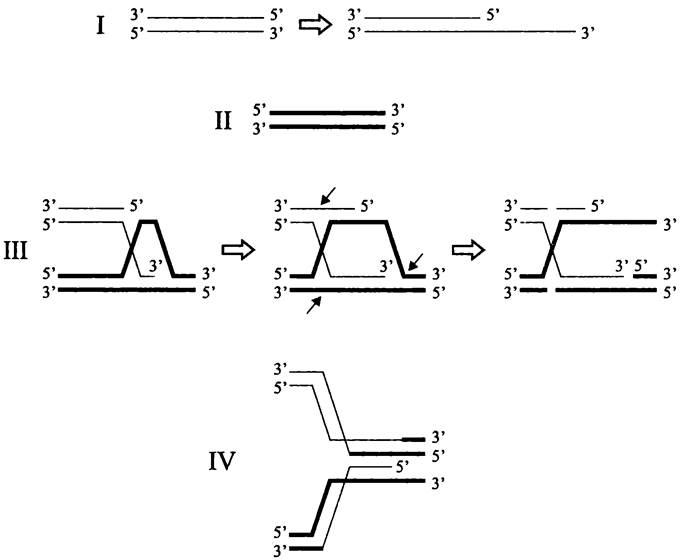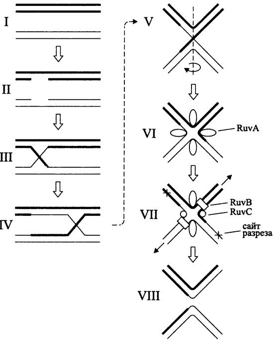 В свою очередь, при гомологической рекомбинации в геноме реципиента на протяженном участке гомологии с чужеродной ДНК происходят инсерции, делеции и другие инфраструктурные изменения. Естественно, что частота гомологической рекомбинации тем ниже, чем меньше взаимное родство донора и реципиента. Кроме того, она контролируется системой исправления ошибок спаривания (см. раздел 16.5.1.3), которая служит дополнительным фактором половой изоляции.
