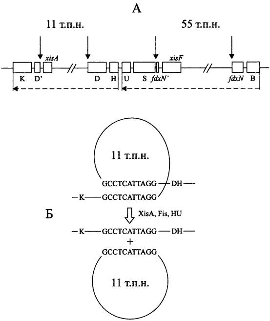 Рис. 209. Ненаследуемая перестройка генов nifD и fdxN при дифференциации гетероцист Anabaena sp. РСС7120. А — схема оперонов nifHDK и nifB-fdxN-nifSU; Б — эксцизияэлемента размером 11 т. п. н. XisA — рекомбиназа; Fis — ДНК-изгибающий белок; HU — ДНК-связывающий белок.