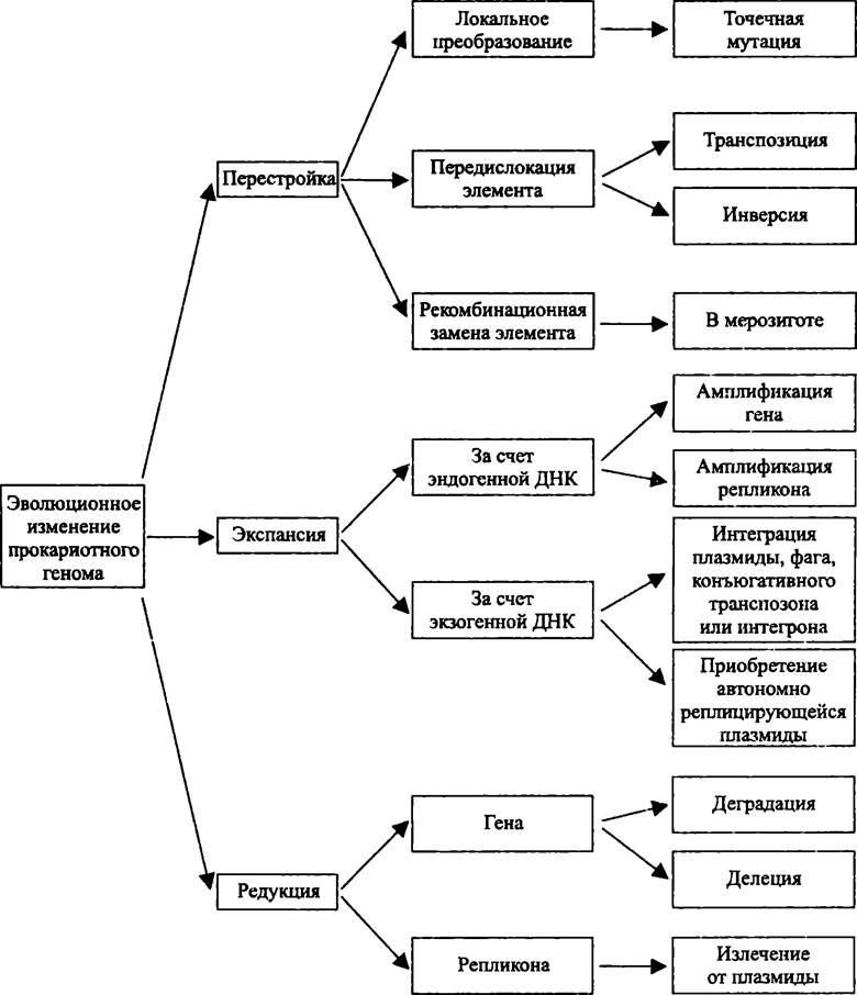 Благодаря секвенированию хромосомной ДНК у нескольких сотен бактерий (особенно близкородственных; см. раздел 16.3.1), а также у нескольких десятков архей установлено, что основными механизмами эволюции прокариотных геномов являются: