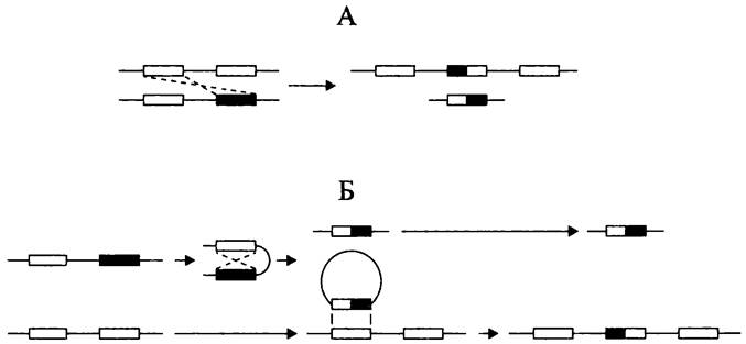 Рис. 211. Каноническая модель дупликации гена. А — асимметричный кроссинговер; Б — эксцизия и реинсерция кольцевого элемента.