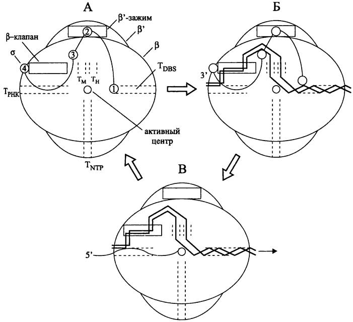 Рис. 213. Рабочий цикл РНК-полимеразы. А — голофермент; Б — открытый комплекс; В — элонгирующий комплекс. Тм — туннель для матричной цепи ДНК; Тн — туннель для нематричной цепи ДНК; Тттр — туннель для нуклеозидтрифосфатов; Трнк — туннель дня выхода РНК; TDBS — туннель (сайт) для связывания посттранскрипционной (downstream) двухцепочечной ДНК.