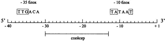 Внутри промоторных участков, связывающих голофермент Еσ70, расположены две высоко консервативные гексануклеотидные последовательности, которые имеют консенсусную (т. е. среднестатистическую) структуру TTGACA и ТАТААТ. Они служат сигналами для связывания РНК-полимеразы и инициации транскрипции. Поскольку центры этих последовательностей лежат на расстоянии 35 и 10 нуклеотидов левее (upstream) стартовой точки транскрипции, они называются блоком -35 и блоком -10. Третьим консервативным участком промотора является спейсер размером 17±1 нуклеотид, расположенный между концом блока -35 и началом блока -10 (рис. 214).