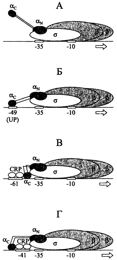 Порознь кор-фермент и субъединица σ почти не проявляют сродства к «неспецифической» ДНК, в то время как голофермент имеет очень высокое сродство к специфическим промоторным последовательностям (константа ассоциации 1 • 10-9М).
