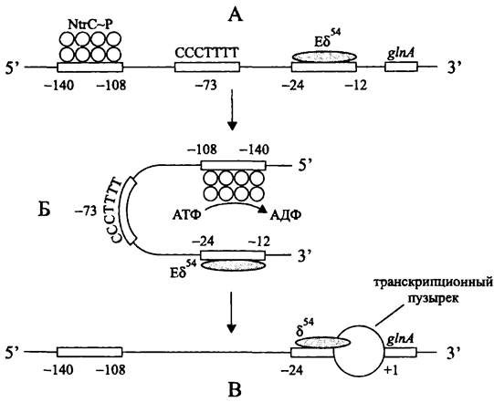 К числу других альтернативных РНК-полимераз относится голофермент Еσ54. В частности, у энтеробактерий и Klebsiella pneumoniae он распознает консервативные последовательности -24 (5'-TGGCAC-3') и -12 (5'-TTGCA-3') в промоторах ntr- генов азотного голодания и nif-генов диазотрофии.