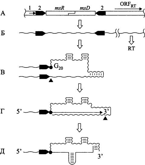 Рис. 218. Синтез ms-ДНК. А — участок хромосомы; Б — первичный транскрипт; В — РНК, выполняющая роль праймера и матрицы; Г — синтез и процессинг РНК/ДНК-интермедиата; Д —ms-ДНК. 1 — промотор первичного транскрипта; 2 — инвертированный повтор; msR — кодирующая последовательность ms-РНК; msD — кодирующая последовательность ms-ДНК; ОRFRT—открытая рамка считывания обратной транскриптазы; RT — обратная транскриптаза; G20 — остаток G20, к которому через связь 2'-5' присоединяются дезоксирибонуклеотиды.
