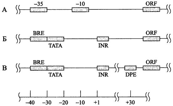 Рис. 219. Сравнительная организация промоторов у бактерий (А), архей (Б) и эукариотов (В). BRE — элемент, узнающий транскрипционный фактор TFIIB; ТАТА — ТАТА-бокс; INR — инициаторный элемент; DPE — downstream-промоторный элемент; ORF — открытая рамка считывания.