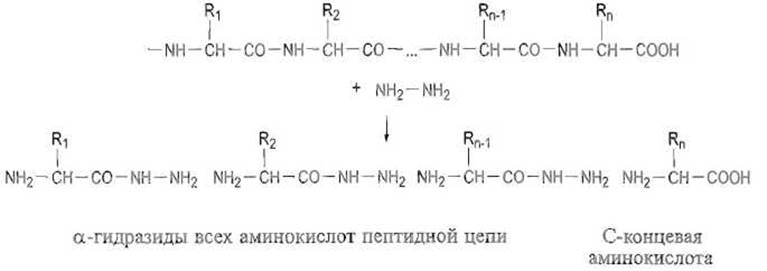 Определение С-концевых аминокислот и последовательностей пептидов разработано недостаточно. Единственным химическим методом идентификации С-концевых аминокислот, получившим распространение, является исчерпывающий Гидразинолиз пептидных связей. При нагревании совершенно сухого препарата белка или пептида с безводным гидразином все пептидные связи расщепляются им с образованием соответствующих гидразидов аминокислот: