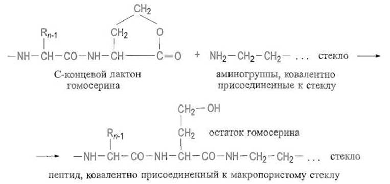 Ввиду этого при анализе протяженных последовательностей чрезвычайно важно, чтобы каждый цикл протекал с выходом, близким количественному. Существенным ограничением являются потери остаточного белка или пептида, в особенности короткого за счет его растворения в используемых реагентах. Радикальный способ борьбы с такими потерями состоит в ковалентном присоединении к инертной матрице, например к макропористому стеклу, содержащему аминные группы. К такому носителю удается присоединить Пептиды, полученные при расщеплении бромцианом за счет реакции лактона гомосерина с аминогруппами: