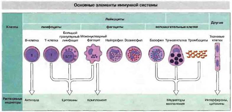 В иммунном ответе участвует целый ряд клеток и выделяемых ими растворимых продуктов. Центральная роль всегда принадлежит лейкоцитам, однако другие Клетки (например, тканевые) также вносят свой вклад, посылая сигналы лимфоцитам и отвечая на цитокины, выделяемые Т-клетками и макрофагами. На рис. 1.4 перечислены основные клетки и молекулы, принимающие участие в иммунологических реакциях организма.