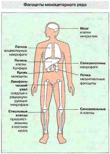 Рис. 1.5. Содержащиеся во многих органах фагоцитарные клетки происходят из моноцитов крови, производимых костным мозгом. Моноциты покидают кровеносное русло и в тканях становятся макрофагами. Местные фагоцитарные клетки различных тканей, ранее относимые к ретикулоэндотелиапьной системе, тоже представляют собой, по-видимому, клетки моноцитарного ряда.