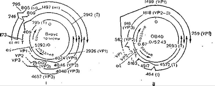Рис. 41. Карта локализации антигенов и структурных белков SV40 (I) и вируса полиомы (II).