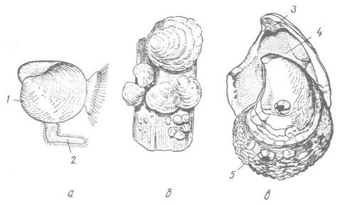 а — повзаюча личинка; б — молоді устриці, що приросли стулками до субстрату; в — черепашка дорослого молюска; 1 — черепашка; 2 — нога; 3 —лігамент; 4 — нижня (ліва) стулка, що приростає до субстрату; 5 — верхня (права) стулка з морськими жолудями на поверхні