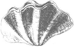 Рис. 46. Ряд Venerida: тридакна (Тrіdacna crocea) — тіло орієнтовано так, як воно розташоване у ґрунті (черевною стороною догори)