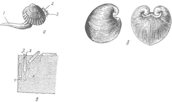 а —їстівна серцевидка (Cerastoderma edule); б — морське серце (Glossus humanus); в — морський черенок (Solen vagina), стадії занурення в ґрунт; 1 — нога; 2 — вивідний сифон; 3 — ввідний сифон