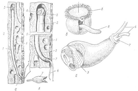 а, б — дорослий молюск у проточених ним ходах; в — личинка велігер; г — молода стадія; 1 — ходи, які просвердлив тередо; 2 — тіло молюска; 3 — черепашка; 4 — сифони; 5 — вапнякова вистилка ходів; 6 — нога; 7 — палетка; 8 — парус