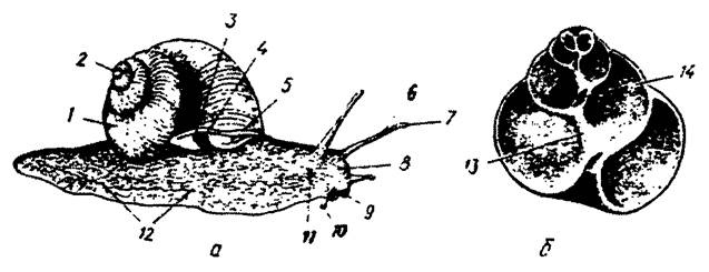 а) зовнішній вигляд з правого боку; б) поздовжній розріз черепашки: І - черепашка; 2 - її верхівка; 3, 4 - анальний та дихальний отвори; 5 - край мантії; 6 - очне щупальце; 7 - око; 8 - ГОЛОВА; 9 - рот; 10 - губне щупальце; 11 - статевий отвір; 12 - нога;