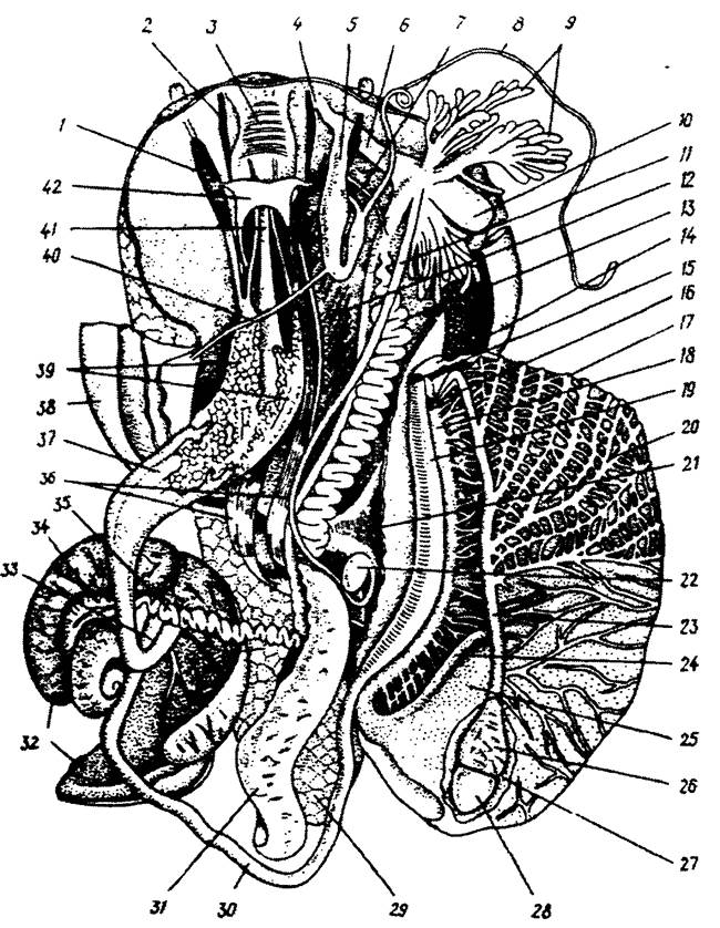 32 - Печінка; 33 ~ Шлунок; 34 - гермафродитна залоза; 35 - гермафродитна протока; 36 - ретрактори голови, глотки та щупалець; 37 - воло; 38 - мантія; 39 - слинні залози; 40 - ретракторкопулятивного органа; 41 - Стравохід; 42 - церебральний ганглій.