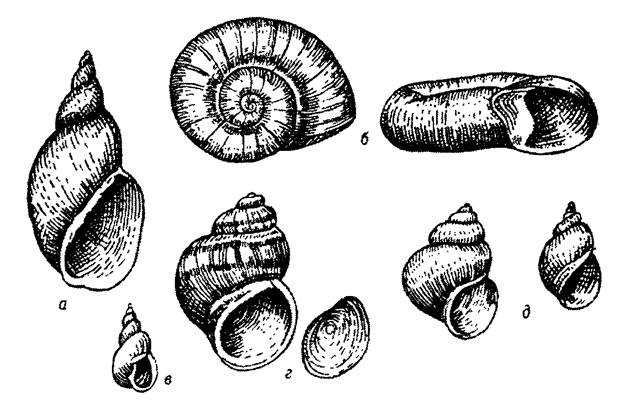 а - ставковик звичайний; б ~ котушка звичайна; в - ставковик малий; г - калюжниця живородна; д - бітинії.