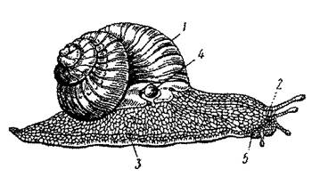 1 - черепашка; 2 - голова з двома парами щупалець; 3 - нога; 4 - дихальний отвір; 5 - статевий отвір.