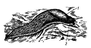 1 - редукована черепашка, обросла мантією; 2 - дихальний отвір.